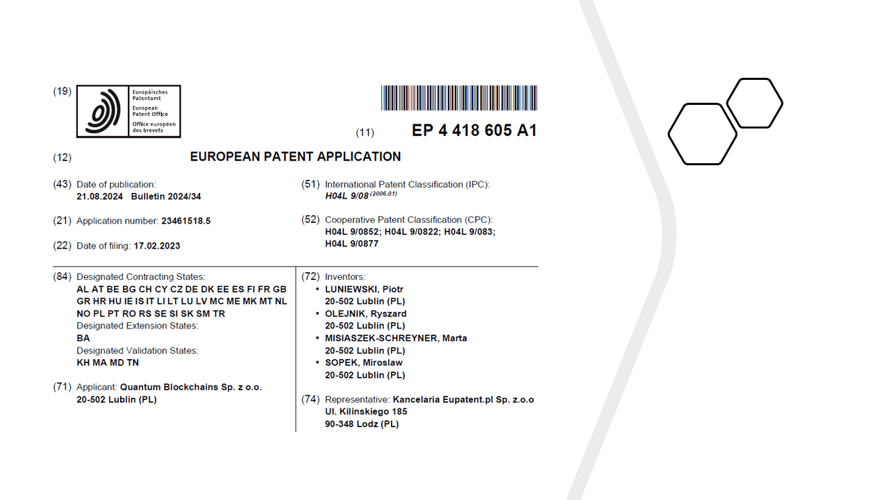 We are thrilled to announce a major milestone at Quantum B. Our patent application for the Post-Quantum Encryption Key Distribution (pQKD) method and a device has been officially published by the European Patent Office (EPO). This patent, filed under application number 23461518.5 and published as EP 4 418 605 A1, will represent a significant leap forward in secure communication and cybersecurity, particularly in the face of potential threats from quantum computers.